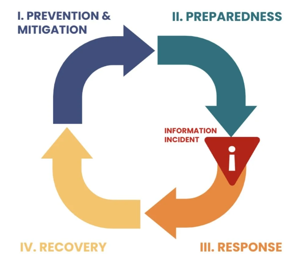 To achieve its objectives, PIER uses the disaster and emergency management cycle as a foundation to ensure activities focus on building resilience in the face of information incidents. This cycle consists of four interdependent phases that can occur sequentially or concurrently across all stages of an incident. Broadly, they fall within a period of normal operations (information ecosystem is in a stable state, information flows continue as normal with minimal fluctuation) and incident operations (information ecosystem is destabilized, information has emerged that has a minor to significant ripple effect on system dynamics).