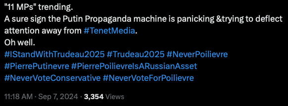 Image 1: Example of a post about the Tenet Media story posted by a Canadian user expressing a politically charged hashtag